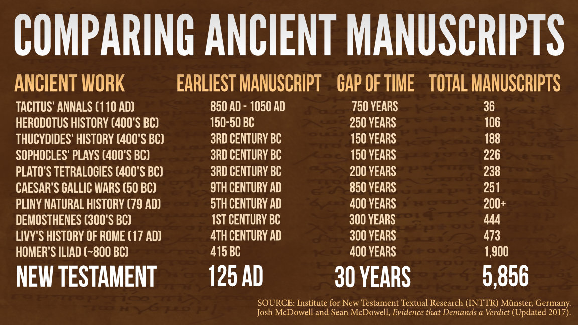 - Poster 2: The fact is that we have more manuscripts for the New Testament than any other ancient document. The other fact is that our closest manuscripts are from only 30 years after the original.