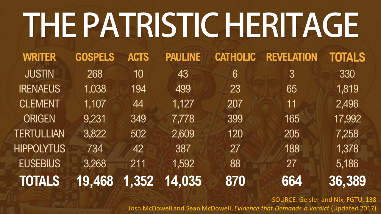 - Poster 3: But we also have tens of thousands of Patristic references to the New Testament which are all within the first Century after Christ from all around the world - and none of them disagree with the text of the New Testament. Justin Martyr lived in Rome, Irenaeus in Asia Minor, Clement and Origen in Alexandria, Tertullian in northern Africa, Hippolytus in Rome, Eusebius in Caesarea