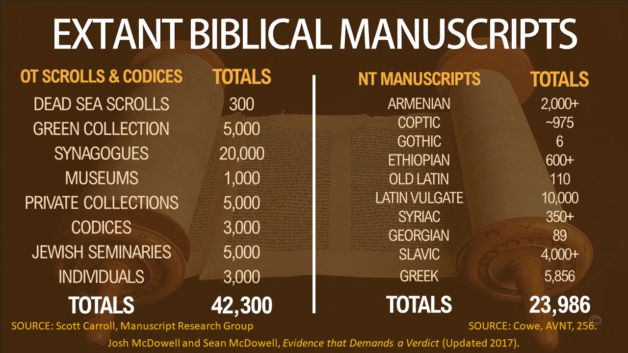 - Poster 1a: There are a lot of manuscripts of the Bible. A LOT. Let's take a look at the Old Testament first. In the Old Testament, we have 42,300 Manuscripts that we have found so far, of the Old Testament. And for the New Testament we have 23,986. The reason that the Old Testament has more, despite being older, is obvious - first because it is older, so has been around for longer, there are more copies, etc. And second because it is preserved by Jews and Christians!